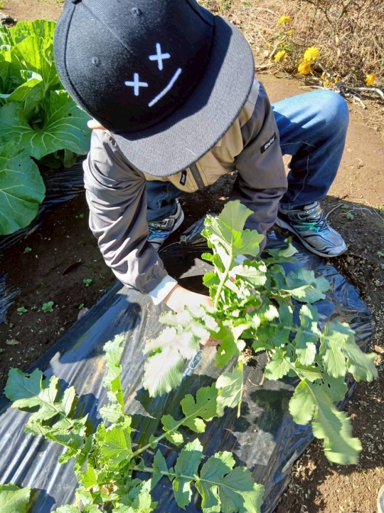 みんなで種を蒔いた大根とミニ白菜の収穫をしました。今日は、いも煮会!材料を収穫に畑に行きました!「できたぞ~!!」あの種が・・・最高!