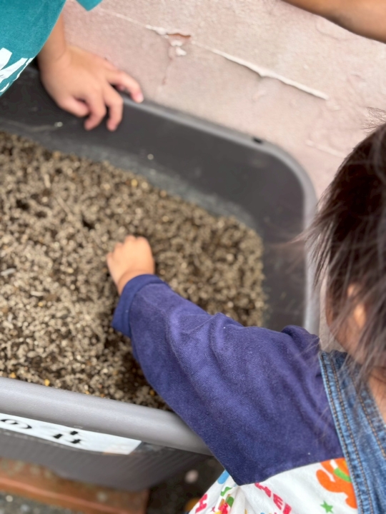 みんなで畑に行き、大根と人参の種まきをしました!種を蒔いてお水をかけるときに「おおきくな~れ!」と声もかけている子もいて可愛かったです。みんな頑張ってできました。