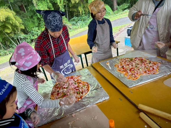 炊事場は屋根もあって全然雨なんて大丈夫!みんなのやる気パワーで、力を合わせて大きなPizzaができました。